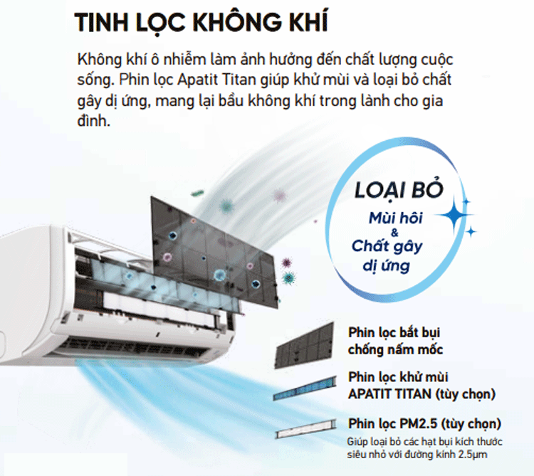 - Lọc không khí: Apatit Titan khử mùi và loại bỏ vi khuẩn, nấm mốc