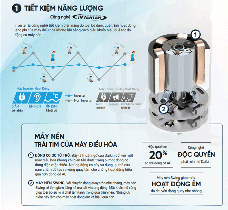 Máy lạnh Daikin FTKA35UAVMV sử dụng máy nén điều khiển bằng công nghệ inverter tiết kiệm điện