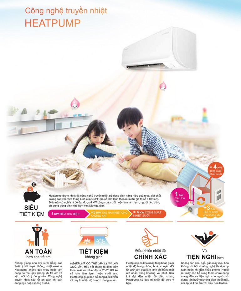 Heatpump (bơm nhiệt) là công nghệ truyền nhiệt sử dụng điện năng hiệu quả nhất, đạt chất lượng cao với mức trung bình của CSPF (hệ số làm lạnh theo mùa) từ giá trị số 4 trở lên. Điều này có nghĩa là để đạt được 4kW công suất làm lạnh, người tiêu dùng sử dụng trung bình nhỏ hơn 1 kW điện.