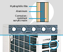 Các dàn tản nhiệt của dàn nóng được phủ một lớp chống ăn mòn đặt biệt: Bề mặt là lớp nhựa Acrylic làm tăng cường khả năng chống lại mưa axit và hơi muối, kế đến là lớp màng ngăn thấm nước có tác dụng chống rỉ sét.