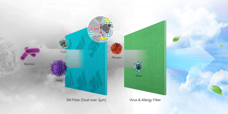 - Sử dụng công nghệ lọc bụi và tiêu diệt vius 3M Filter (Dust over) và Virus & allergy filter