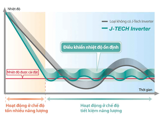 Chức năng J-Tech Inverter khi hoạt động với công suất tối đa có thể tiết kiệm điện tiêu thụ đến 60% so với máy lạnh thông thường.