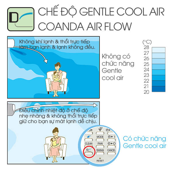 Chế độ Gentle Cool Air thổi không khí lạnh hướng lên trần nhà thay vì hướng xuống đất, nơi có các em bé, phụ nữ mang thai, người già, hay những người có cơ thể không chịu được không khí quá lạnh. Chế độ gió này sẽ đem đến cho bạn những đêm ngon giấc