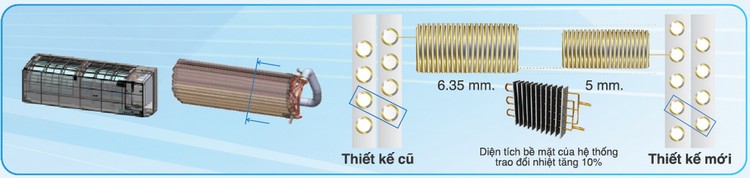 Bằng thiết kế cải tiến mới, thay đổi kích thước ống đồng nhỏ lại dẫn đến số lượng ống đồng, lá nhôm tăng nhiều hơn làm gia tăng diện tích bề mặt tiếp xúc giúp, sự trao đổi nhiệt diễn ra nhanh hơn nên máy có khả năng làm lạnh cực nhanh.