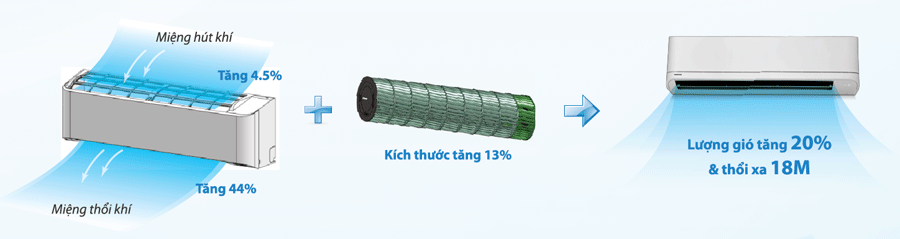 Hệ thống tạo luồng gió cực mạnh, cánh đảo gió dài và góc thổi rộng